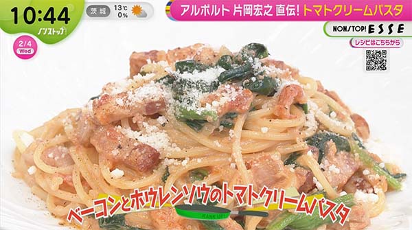 2026年2月4日、「ノンストップ」で紹介された「片岡流・ベーコンとホウレンソウのトマトクリームパスタ」のレシピ