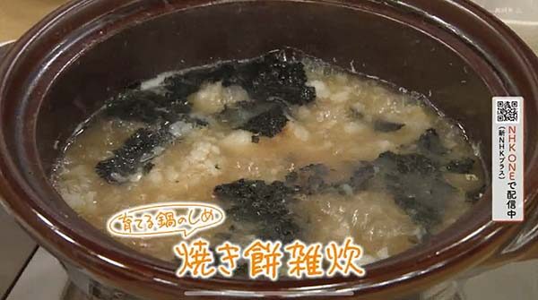- 鍋から具材をすべて取り出し、ご飯茶碗2杯分くらいと、オーブントースターでこんがり焼いた切り餅(1〜2コ)を加え、弱火にかける。切り餅がトロトロに柔らかくなったら、焼きのり(全形)1枚をちぎって加え、溶かすように混ぜれば完成!