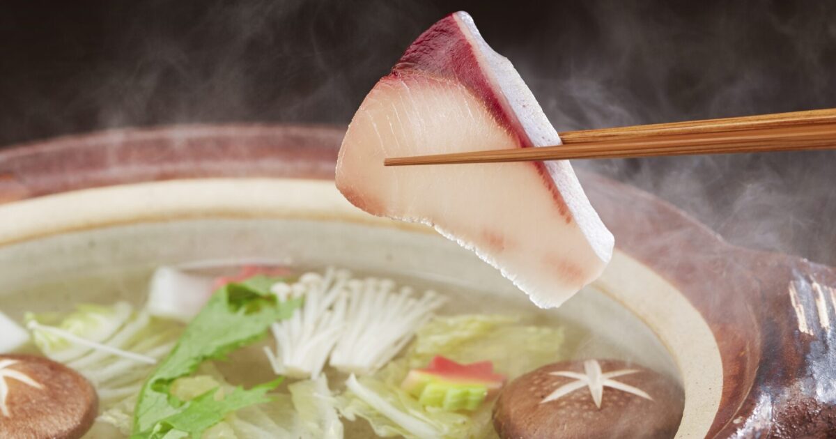 - ①の昆布だしに酒(大さじ2)を加えて混ぜ、③の野菜適量を加える。再び煮立ったら、ぶりを1枚ずつ昆布だしにくぐらせる。ぶりの表面が白くなったら、野菜とともに引き上げ、ポン酢しょうゆと柚子こしょうにつけて食べる。