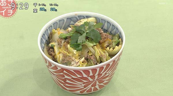 2026年2月26日、NHK「あさイチ」で紹介された、「豚ひき肉と春キャベツの卵とじ丼」の作り方。