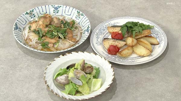 教えてくれたのは、「新たまと鶏肉の甘酢あえ・春キャベツとあさりの和風蒸し煮・新じゃがとさわらのローズマリー焼き」の3品。