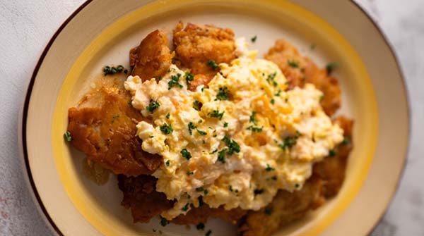 • タルタルソースをつくる。③のフライパンの汚れをペーパータオルできれいにし、サラダ油適量を中火で熱し、溶いた卵を流し入れてスクランブルエッグをつくる。【C】を加えて混ぜ合わせ、③の肉にかけ、パセリをふれば完成!