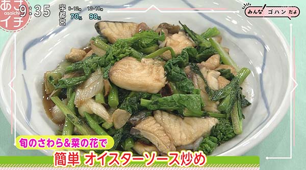 2026年3月3日、NHK「あさイチ」で紹介された、「さわらと菜の花オイスターソース炒め」の作り方。