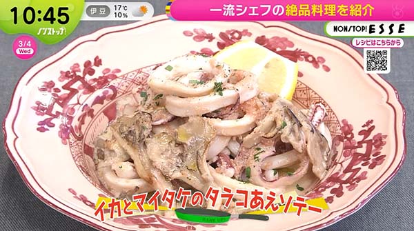 2026年3月4日、「ノンストップ」で紹介された「桝谷流・イカとマイタケのタラコあえソテー」のレシピ。