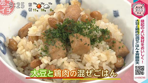 2026年3月11日、NHK「あさイチ」で紹介された、「大豆と鶏肉の混ぜご飯」の作り方。