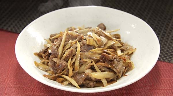 - フライパンを中火にかけてサラダ油をひき、ごぼうを炒める。全体に油が回って透き通った感じになったら、牛肉を加え炒める。