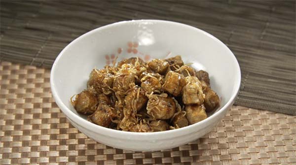 - やわらかくなるまで茹でたら水気を切り、粗熱をとってポリ袋に入れる。片栗粉を入れて全体にまぶし、180℃に温めた油でカラッとなるまで揚げる。こんにゃくはスプーンで一口大にちぎる。