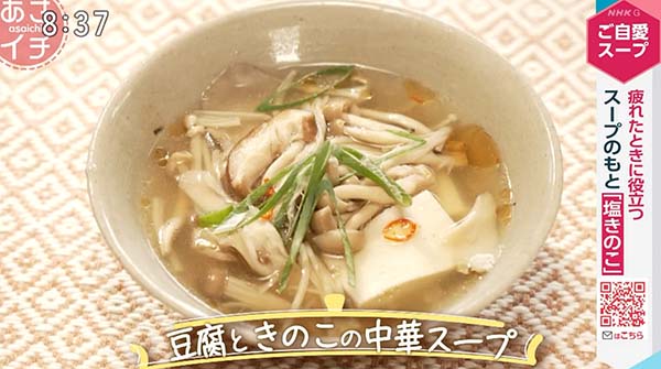 2026年3月11日、NHK「あさイチ」で紹介された、「豆腐ときのこの中華スープ」の作り方