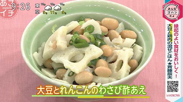 2026年3月11日、NHK「あさイチ」で紹介された、「大豆とれんこんのわさび酢和え」の作り方。