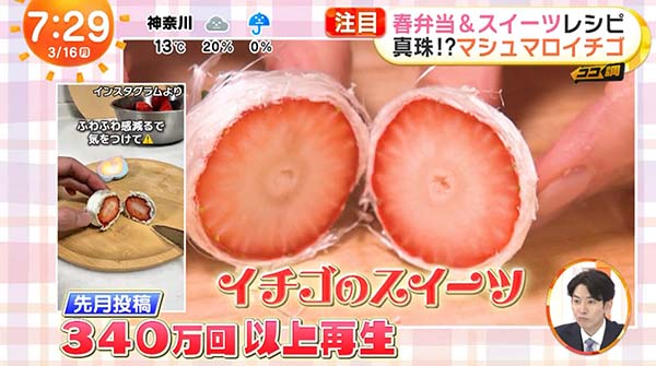 2026年3月16日放送のめざましテレビのココ調で放送された、「マシュマロイチゴ」のレシピをご紹介。