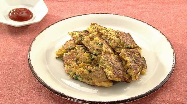水溶き片栗粉の秘訣:卵液に水溶き片栗粉を加えて合わせることで、具だくさんでも崩れにくく、食べ応えのある仕上がりになります。