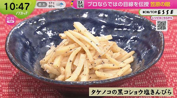 2026年3月31日、「ノンストップ」で紹介された「タケノコの黒コショウ塩きんぴら」のレシピ。