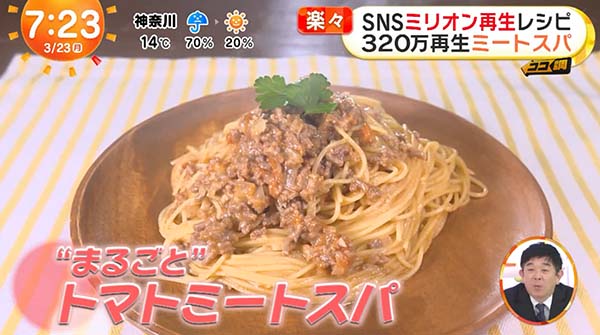 2026年3月23日放送のめざましテレビのココ調で放送された、「まるごとトマトミートスパのレシピ」をまとめてご紹介します。
