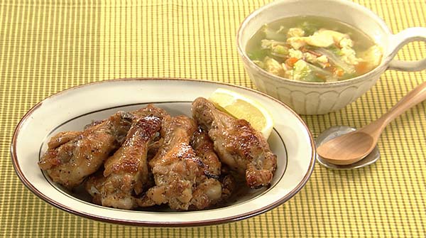 満足度の高い献立セット:パンチの効いた黒こしょうチキンに、春キャベツの甘みが活きたやさしい味わいのスープを合わせることで、味のバランスが完璧な食卓になります。