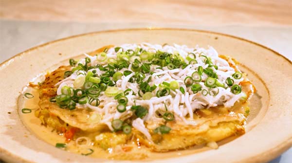 2026年4月1日、テレビ朝日「有働由美子の健康案内人」で紹介された、「しらすのせキャベツのお好み焼き」の作り方。