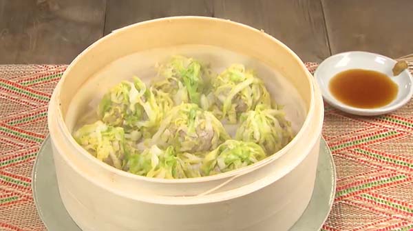 - 肉ダネの周りに春キャベツをつけて、せいろに並べて沸騰した蒸し器で5分蒸す。