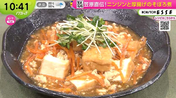 2026年4月7日、「ノンストップ」で紹介された「ニンジンと厚揚げのそぼろ煮」のレシピ。