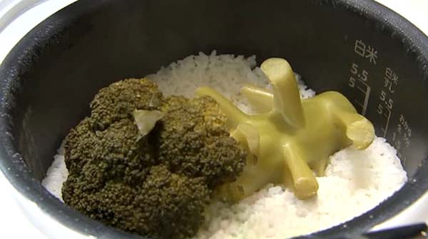 • 炊飯器の内釜に米、酒、塩、コンソメ、水を2合の目盛りより2mmほど下まで入れて混ぜ、米を平らにならす。ブロッコリーをのせて通常炊飯する。