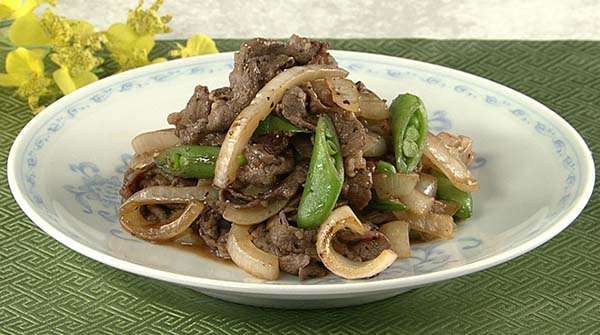 - フライパンにサラダ油を熱し、新玉ねぎを強火で炒め、牛肉、黒こしょう、にんにくのみじん切りを加えて炒め、スナップえんどうを加えて炒め、③を2~3回に分けて加えて炒め、器に盛れば完成!