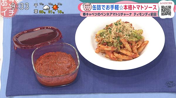 2026年4月13日、NHK「あさイチ」で紹介された、「超簡単!手作りトマトソースで春キャベツペンネ」の作り方。