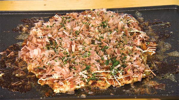 • 火が通ったら、再度裏返して肉を上にし、ソース、マヨネーズ、花かつお、青のりをかけて完成!