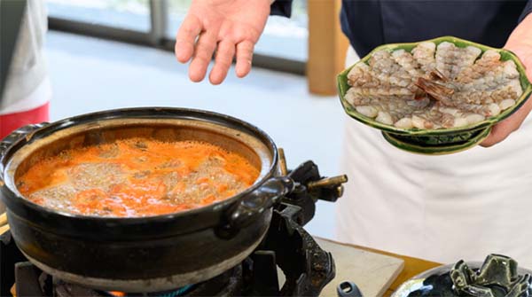 - 幸えびの頭と殻を鍋に入れ、香ばしく炒める。