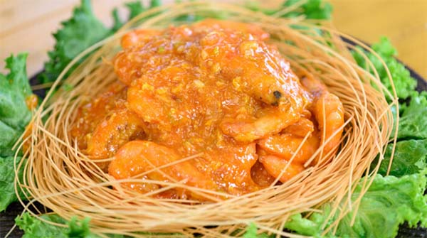 • 皿にサラダ菜を敷き、揚げた素麵を円形に整え、その中にエビチリをこんもりと盛り付れば完成!