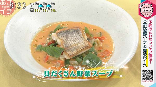 2026年2月25日、NHK「あさイチ」で紹介された、「魔法のソースで味変!【あさイチ】具だくさん野菜スープ 太刀魚のソテーを添えて」の作り方をご紹介します。。